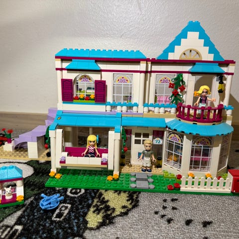 LEGO Friends Heartlake Ystävyyden talo. Emma-hahmo puuttuu (korvattu Emmalla), samoin kaukoputki katolta. Muuten kaikki tallessa. Rakennuskohde mukana.