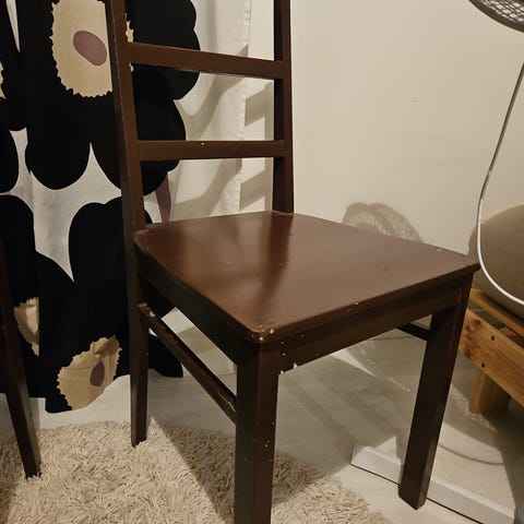 Aikaa nähnyt puinen rustiikkinen tuoli. Istuin korkeus 39 cm. Ajan patina näkyy mm. istuimen kannen halkeamana ja maalipinnassa. Lämminhenkinen eteisen valopilkku😄. Nouto Joensuun keskustasta.