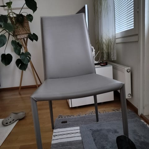 Pöydän halkaisija 80cm ja korkeus 71cm. Pöydän pinnalla ja reunoissa käytön jälkeä, katso kuvat. Tuoleissa irroitettava musta kangaspäällinen, alla harmaa tekonahkapäällinen. Tuoleissa jonkin verran narinaa istuessa. Tästä saa hyvin myös neljän hengen ruokailuryhmän tuoleja lisäämällä.