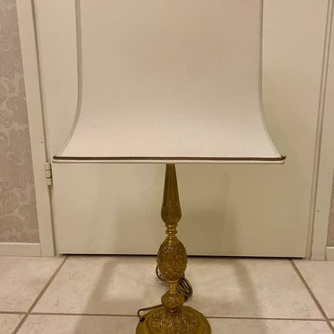 Koristeellinen messinkinen jalka ja näyttävä keltainen hapsuvarjostin, joka luo lämpimän tunnelman. Korkeus 67 cm.