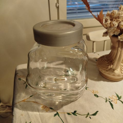 Pieni lasinen säilytyspurkki 2€.
