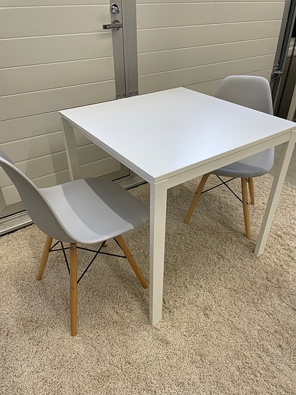Ruokapöydän tuolit ovat seisseet käyttämättöminä esittelyasunnossa ja ovat erinomaisessa kunnossa. Ainoastaan yhden selkänojan puuosassa pieni, lähes huomaamaton jälki (kts. kuva).