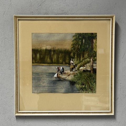 Pastelliteos, jossa on rauhallinen järvimaisema. Kuvassa näkyy koivuja ja vedenpintaa, joka heijastaa ympäröivää luontoa. Kehys on leveä ja kulunut, mikä antaa teokselle vanhan ajan tunnelmaa.