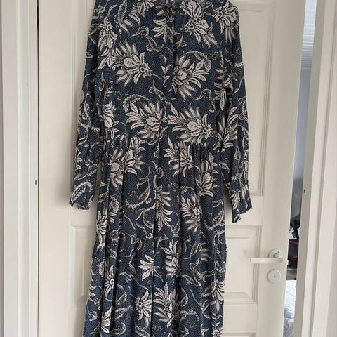 Kiva arkimekko, koko S-M. Sininen pohjaväri ja kauttaaltaan kukkakuvioitu. Pitkät hihat ja väljä, laskeutuva malli. V-kaula-aukko. Ei taskuja. Sopii arkeen ja rennompaan pukeutumiseen, mutta menee myös asustamalla juhlavampiin tilaisuuksiin.