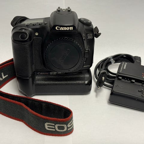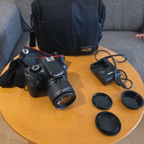 Canonin vanhempi semipro digitaalinen järjestelmäkamera APS-C magnesium rungolla ja EF 28-80mm f/3,5-5,6 zoom objektiivi (full frame objektiivi, jos myöhemmin päivität täydenkoon kennoon, tämä toimii siinä myös). Kameran rungossa on naarmuja, linssit ovat hyvässä kunnossa. Mukaan runkotulppa, hihna, alkuperäinen laturi, kaksi akkua joista huonomalla ottaa noin 50 kuvaa, usb kaapeli, UV filtteri ja 64MB CF-kortti.