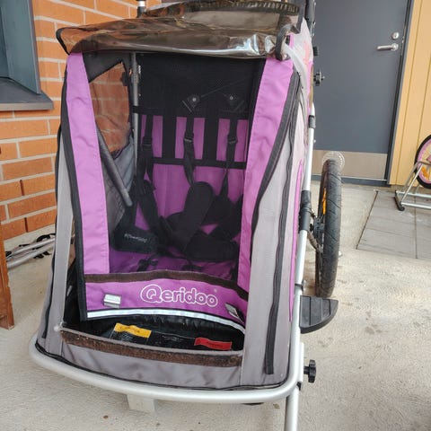 Myydään Qeridoo Sportrex1 pyöräkärry. Yhden lapsen kuljetukseen. Sadesuoja ja takana tavaraluukku. Varustettu kolmella pyörällä, joista edessä kääntyvä pienempi pyörä juoksu- ja kävelykäyttöön sekä takana isot ilmakumirenkaat. Jonkin verran käytön jälkeä mutta toimiva ja kevyt vedettävä kärry pyörän perään.