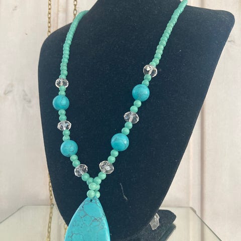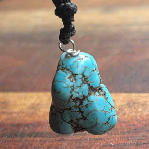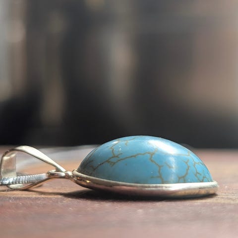 Turkoosinsävyinen kiviriipus, jossa on kauniisti elävä pinta ja luonnollinen kuviointi. Sävy tuo mieleen rauhallisen veden ja toimii pehmeänä katseenvangitsijana ilman, että koru tuntuu liian näyttävältä.