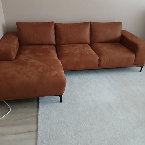 Konjakinruskea Scandic Copenhagen sohva kulutusta kestävällä Colorado Bonded nahalla (70% aito nahka ja 30% keinokuitu). Helposti puhdistettava materiaali. Sohvassa irralliset ja käännettävät selkätyynyt. Istuintyynyt myös irralliset. Mustat metallijalat (korkeus 18cm). Hyvä ja tukeva istua. Paino noin 70kg. Ostettu Seinäjoen Kaluste-Kavereilta.
