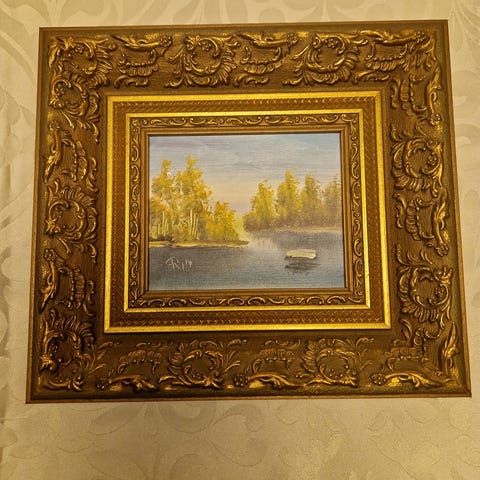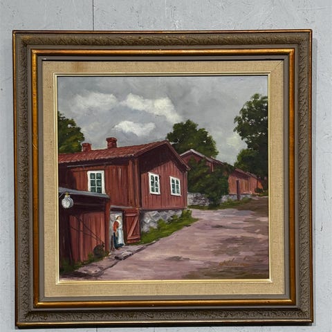 Maalaus ja kehys ovat hyvässä kunnossa ilman näkyviä vaurioita.