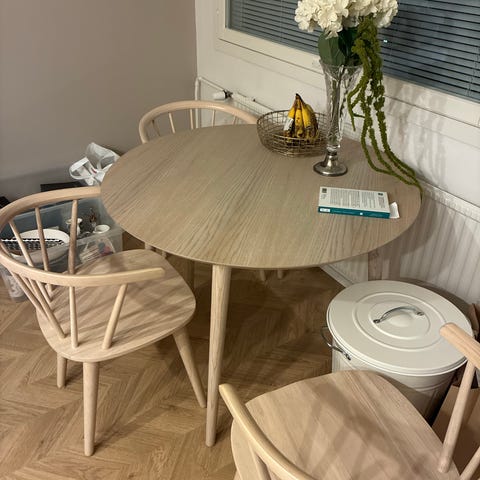 Myydään yhdessä, pyöreä ruokapöytä, jossa puunsävyinen kansi ja mustat metallijalat. Neljä mustaa tuolia. Muuten hyvässä kunnossa, mutta pöydässä pieni jälki josta väriä lähtenyt.