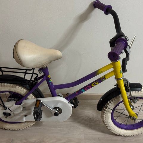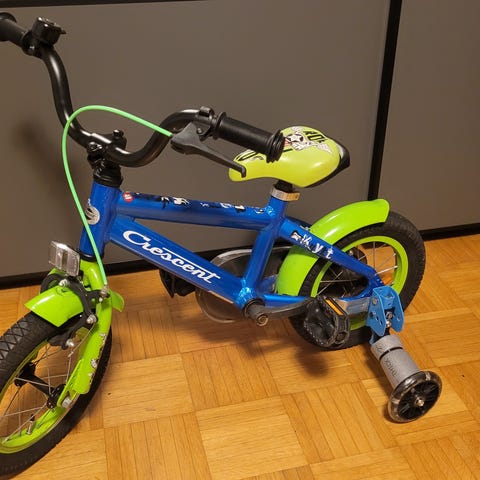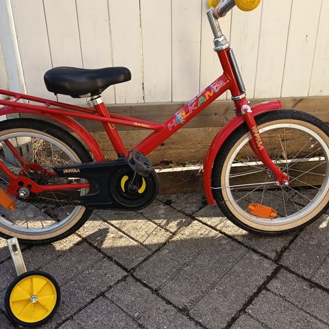 Helkama lasten polkupyörä, jossa 12" renkaat. Pyörässä on takatavarateline, ketjusuoja sekä käsijarru edessä ja jalkajarru takana. Satula ja ohjaustanko ovat säädettävissä lapsen pituuden mukaan. Mukana tulee irrotettavat apupyörät ja työntöaisa, jotka helpottavat ajamisen opettelua.