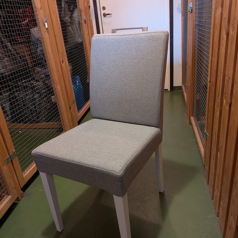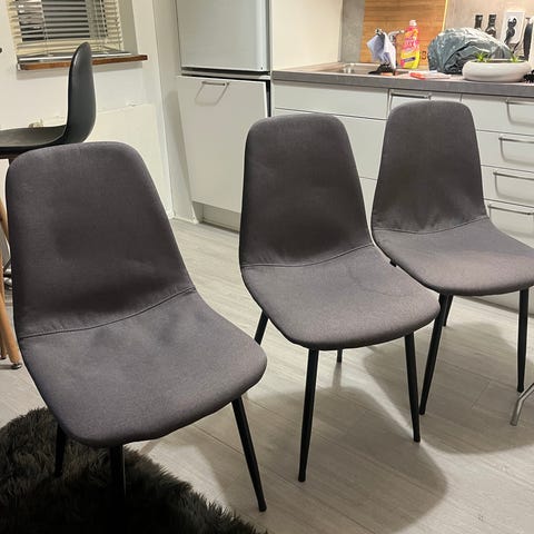 Erittäin tukevat ruokapöydän tuolit. Harmaata keinonahkaa. Tuolien pinta on rikkoutunut (lähikuvat), yleisilme kuitenkin siisti. Hinta yhteensä 40€.