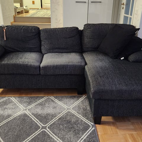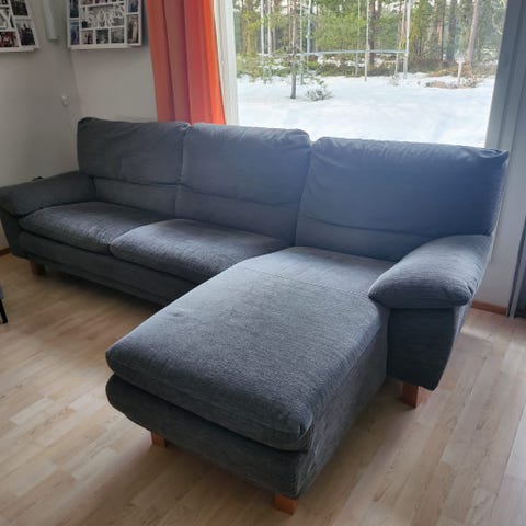 Noin 20 vuotta vanha. Lievää käytön jälkeä. Irrotettavissa kolmeen osaan. Syvyys divaanin kohdalla 150 cm ja muuten 94 cm. Reunimmaisessa osassa toimiva mekanismi.