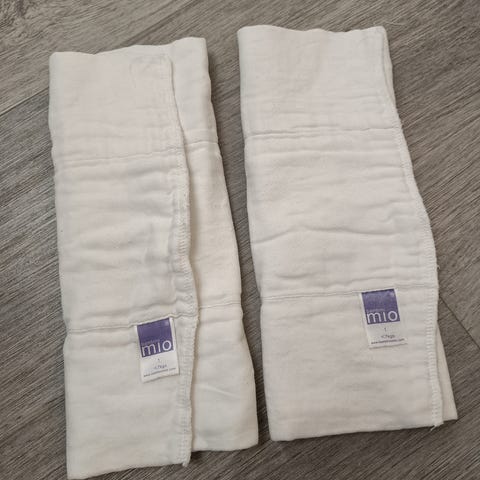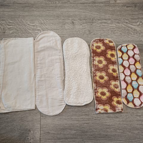 Sekalaisia imuja kestovaippoihin, nämä mielestäni hitaita imuja, mm. Jutta tuotteen bambua. Oikean reunimmaisen materiaalista en ole varma, se muita pehmeämpi ja notkeampi.