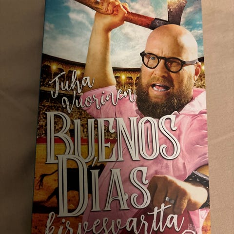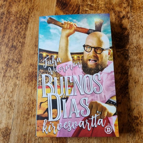 Juha Vuorinen Buenos Días kirvesvartta -kirja. Suomenkielinen pokkari, kustantajana Diktaattori. Teos jatkaa Juha Vuorisen humoristista ja tarinallista tuotantoa, jossa kuvataan muun muassa matkailua ja arjen tilanteita. Sopii lukijalle, jota kiinnostavat kevyet ja humoristiset kertomukset. Voin lähettää. Mmm.