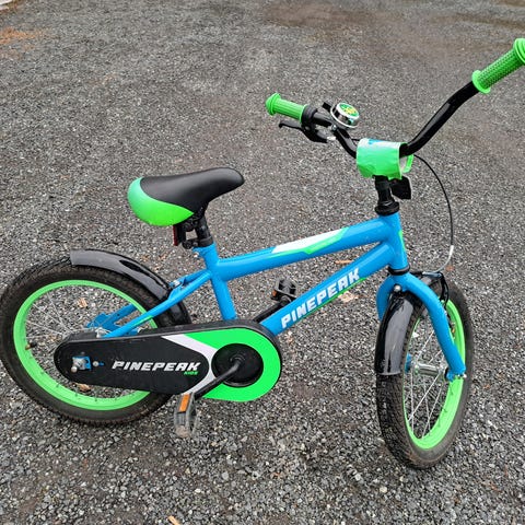16-tuumainen Helkama Soma lastenpyörä. Pyörässä on jalkajarru, etukori, tavarateline, lokasuojat, seisontajalka ja ketjusuoja.