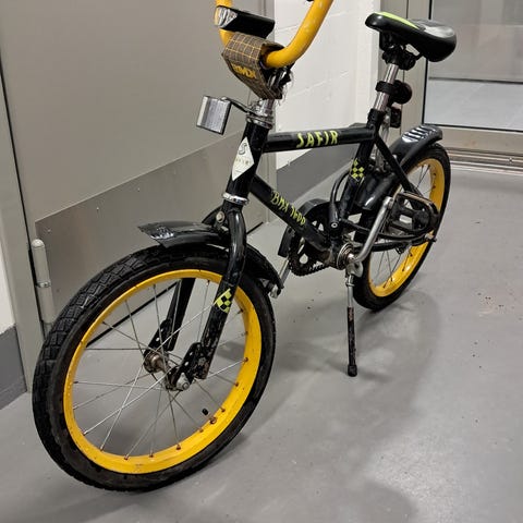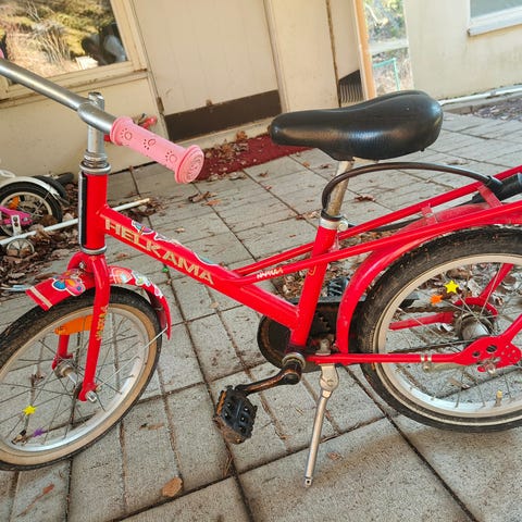 Pyörä valmis heti ajettavaksi. Käyttäjä koristellut ketjukotelon tarroilla, jotka eivät ihan vain repäisemällä irronneetkaan. Siksi en lähtenyt niitä nyt irrottamaan.