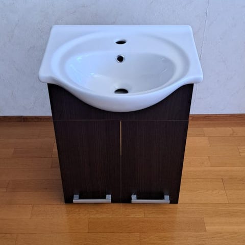 Pesuallas on upotettu allaskaapin päälle. Allaskaapissa on kaksi ovea ja sisällä hyllytaso putkivedoille varatulla tilalla. Peilikaapissa on useita hyllyjä säilytystä varten sekä yläreunassa valaisin. Kokonaisuus soveltuu kylpyhuoneeseen tai wc-tilaan pesualtaaksi ja säilytysratkaisuksi hygieniatarvikkeille ja muille pientavaroille.