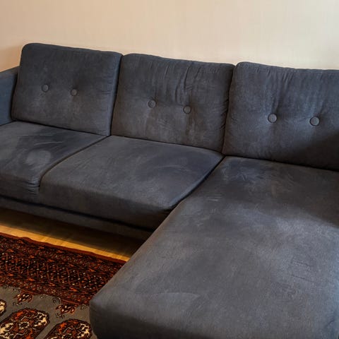 Sohva on hankittu neljä vuotta sitten Vepsäläisestä. Sohvassa on istuin tyynyssä pieni reikä, mutta muuten sohva on hyvässä kunnossa.