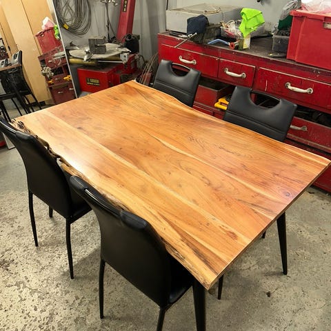 Pöytä muuten hyvässä kunnossa mutta yhdestä kohtaa ottanut osumaan ja muutenkin pieniä käytön jälkiä löytyy. Tuolit hyvässä kunnossa eikä jälkiä oikeen ole.