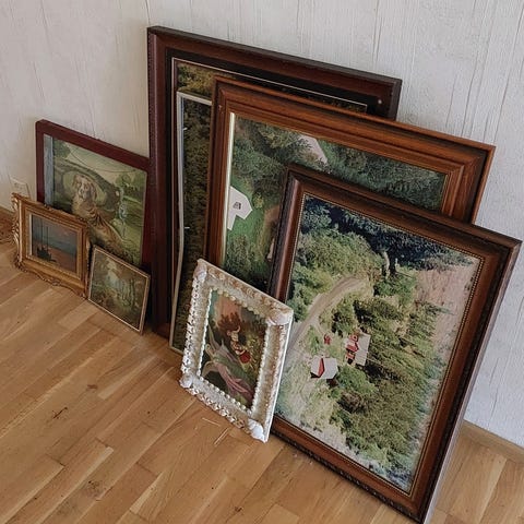 Taulut olleet kinni seinällä sinitarralla, joten nurkissa näkyy hiukan tarran jälkiä