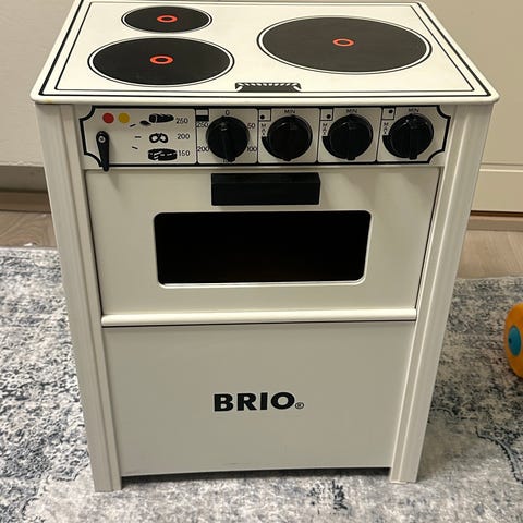 BRIO leikkiuuni lapsille. Valkoinen puinen leikkihella, jossa pientä kulumaa levyissä, muuten ehjä. Nouto Helsingin Meilahdesta.