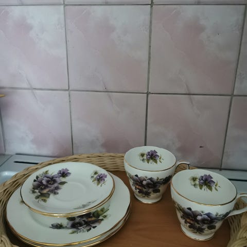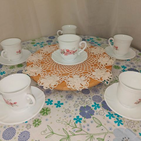 Kukkakuvioitu kahviastiasto, jossa kuppeja6 kpl,tansseja 6 kpl ja lautasia 6 kpl ja pieniä lautasia esim. Teelipuille.Astiat ovat valkoista posliinia, joissa on sinisävyinen reunus ja monivärinen kukkakuvio keskellä. Sopii kahvi- tai teehetkiin useammalle hengelle. Myydään kokonaisuutena kuvien mukaisena sarjana.