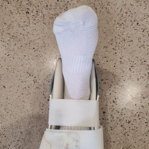 Muovinen nilkkatuki, jossa pehmustetut sisäosat ja tarrakiinnitys. Tuki koostuu kahdesta kovasta sivuosasta ja pehmeästä sisäpehmusteesta, jotka kiinnitetään säädettävillä tarranauhoilla nilkan ympärille. Tarkoitettu nilkan tukemiseen ja stabilointiin. Väri valkoinen.