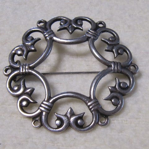 Hopeinen Kalevalakorun Suotniemen solki vuodelta 1939.