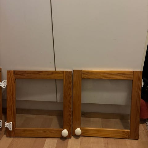 Kaksi kappaletta lasiovia hyllykköön tai vitriiniin. Jousitetut saranat ja puiset kahvat ovat valmiina kiinni. Toisessa ovessa alakulmassa pieni lohkeama mutta näkyy vain läheltä katsoessa.
