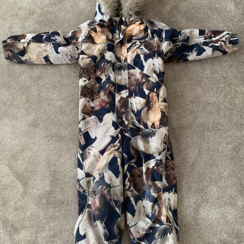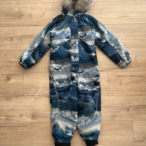 Hyväkuntoinen molon toppahaalari koossa 116. Peppu ja polvet kuluneet.