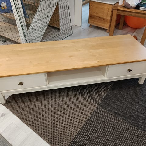 Täyspuinen tv-taso, jossa puun värinen kansi ja runko valkoinen. Maalipinnassa on paikoittain kulumaa. Taso on jo elämää nähnyt, mutta silti vielä käyttökelpoinen. Rungon keskeltä puuttuu jalka (puuttunut jo meille tullessa). Hyllyssä on säilytetty kirjoja, jonka seurauksena runko on päässyt elämään ja notkistumaan. Lisäjalalla ja liimauskella rungon saa varmasti suoraksi. Toki toimittaa virkansa näinkin. Lasiovien takana kulmissa reiät mahdollisille johdoille.