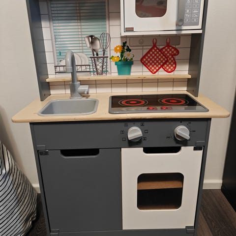 Myydään Biltema leikkikeittiö. Hellan valot eivät toimi. Parin kiinnityskohdan liitokset vähän revenneet kasatessa, kuvissa näkyy.