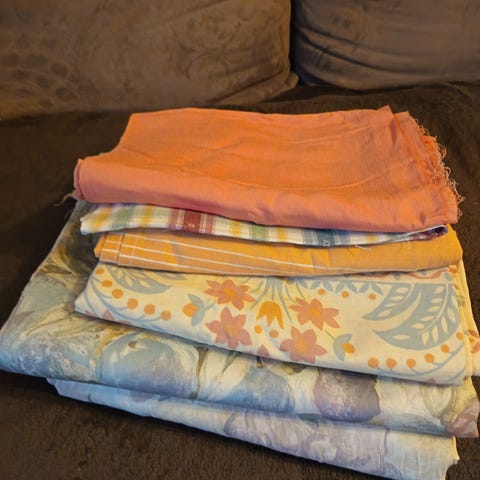 Monivärinen kudottu seinätekstiili, jossa on raidallinen ja kuvioitu reunapaneeli sekä pitkät, punotut ripustusnarut ja tupsut. Pääväreinä ovat oranssi, punainen, vihreä, keltainen ja tummanruskea. Tekstiili sopii käytettäväksi seinäkoristeena tai sisustuselementtinä. Materiaali vaikuttaa olevan paksua, karkearakenteista lankaa tai villaa.