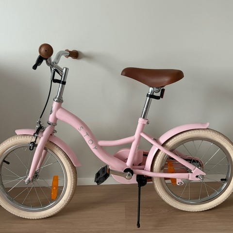 . Lastenpyörässä on 14” tuuman renkaat, vaaleanliila runko ja vaaleat renkaat. Satula ja käsigripit ovat ruskeat. Pyörässä on etukäsijarru sekä takanavassa jarru, ketjusuoja ja lokasuojat edessä ja takana. Soveltuu pienille lapsille, jotka opettelevat ajamaan polkupyörällä.