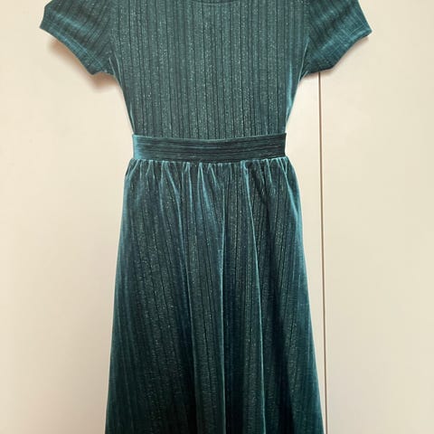 Mekko koossa 122/128. Vaalean vihreä kankainen, pehmeä yläosa, helma kiiltävä, liukas ja leveä kukkakuosilla. Vyötäröllä rusetti.
