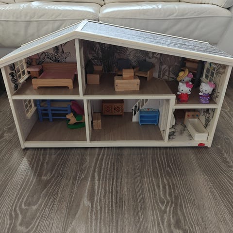 Lundby nukkekoti, useampikerroksinen talo avoimella etuosalla. Vaatii putsauksen ja vähän ruuvien kiristelyä niin on vielä ihan hyvä!