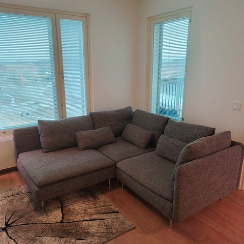 Myynnissä erittäin suuren suosion saavuttanut Ikean Söderhamn sarjan pieni kulmasohva käsinojilla. Ryhmä sisältää 2 x 1:n istuttava osa, kulmapala ja 2 x käsinoja. Kaikkien osien rungot ovat ehjät. Ryhmää pystyy käyttämään myös ilman käsinojia, sillä ryhmän päälliskankaaseen ei ole tehty käsinojien reikiä. Päällisten väri: Leide harmaa / musta. Ryhmän kaikki päälliset ovat irroitettavissa pesuun. Runkojen päälliset mukaan lukien. Lisäksi päälliset ovat halutessaan vaihdettavissa. Huomioitavaa sohvan kunnossa: Kulmapalan toisessa sivussa pieni tahra. Ei näy päivittäisessä käytössä mihinkään. Ryhmän hinta: 649€.