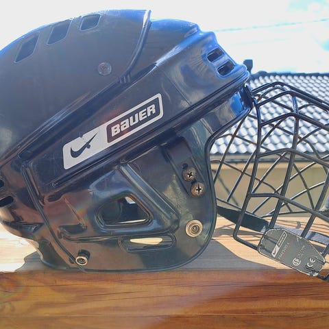 Bauer jääkiekkokypärä ristikolla, väri musta. Kypärässä on metallinen kasvosuoja sekä säädettävä leukahihna. Soveltuu jääkiekkoon ja muuhun jääurheiluun, jossa tarvitaan pään ja kasvojen suojaa.