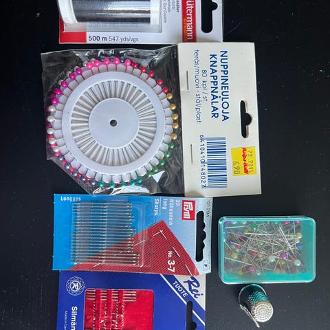 Sekalainen erä ompelutarvikkeita. Kuvatun erän tuotteisiin kuuluu muun muassa erilaisia ompeluneuloja, hakaneuloja, kuminauhaa, ompelulankaa sekä muita pienten korjaus- ja ompelutöiden tarvikkeita. Sopii kotikäyttöön vaatteiden ja tekstiilien korjaukseen ja muokkaamiseen. Kaikki tuotteet myydään yhdessä eränä kuvien mukaisesti.