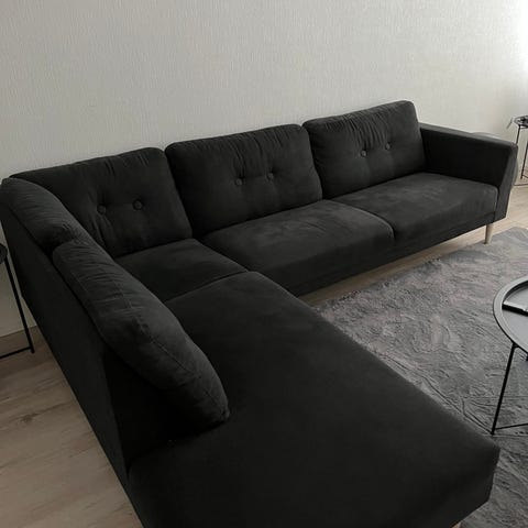 Tumman harmaa kulmasohva, kätisyys ei vaihdettavissa.