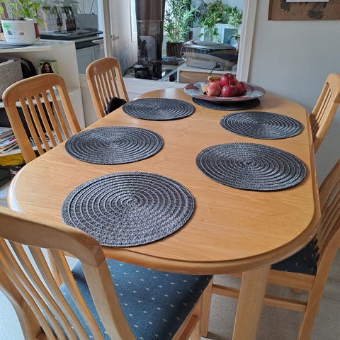 Elämää nähnyt. Yhdestä tuolista puuttuu yksi selkänojan poikkipuu. Lasten piirustelun jälkiä. Saa pyöreäksi pöydäksi tai lisäkappaleen kanssa ovaalin muotoiseksi mikä lisää pituutta (140cm).