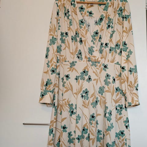 Pitkä, mustavalkoinen kukallinen mekko.