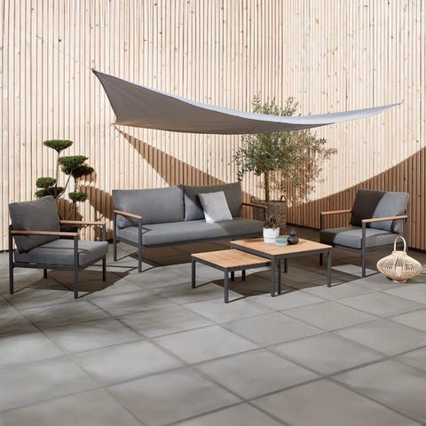 Siistit ehjät kalusteet. Muutamassa on tyynyt mukana. Tyynyt olleet suojassa. Yhdessä tuolissa käsinojan kohtaa reikä.