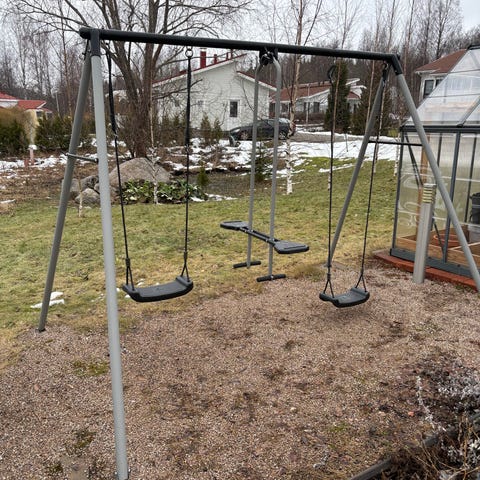 Rautainen pihakeinu lapsille. On hyvä, kestävä, siisti. Ei mikään rimpula, kestää mitä vaan. Korkeus 3m. Riittää siis hyvin kaivaa maahan ja valaa vaikka betoniin. Leveys 3,1m. Hyväkuntoinen hämähäkkikeinu mukaan ja kohtuullinen lautakeinu.
