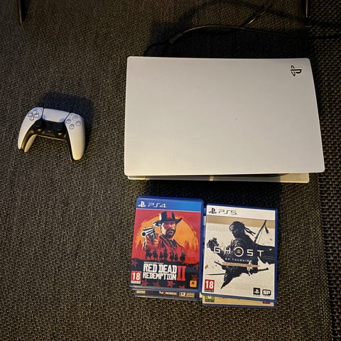 Sony PlayStation 5 pelikonsoli valkoinen. Kuvissa näkyy konsoli sekä kaksi ohjainta. Konsoli soveltuu PlayStation 5 -peleille ja tukee muun muassa verkkopelaamista ja suoratoistopalveluita. Mukana näkyy myös erillinen latausasema ohjaimille sekä konsolin jalusta pakkauksineen. 825gt. Ei levy paikkaa. Juuri huollosta tullut. Ei oo käytetty sen jälkeen