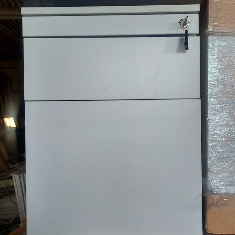 Kolmella vetolaatikolla varustettu laatikosto. Ylimmässä laatikossa on lukko ja avainpesä, keskimmäisessä laatikossa irrotettava lokero pienille tarvikkeille ja alimmassa laatikossa syvempi säilytystila. Laatikosto on valkoinen ja sopii esimerkiksi toimistoon, työpisteelle tai säilytyskalusteeksi.
