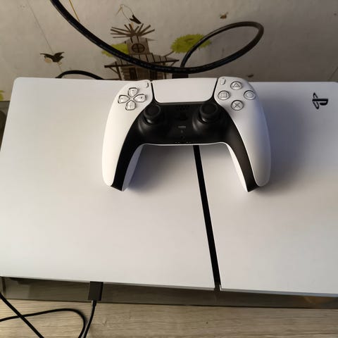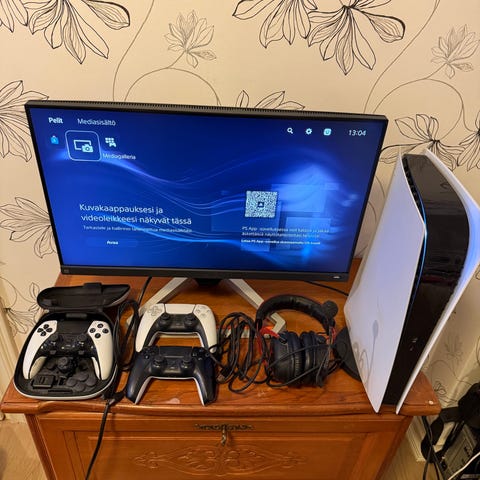 Sony Playstation 5 pelikonsoli valkoinen. Mukana kaksi valkoista DualSense-ohjainta sekä virtajohto ja HDMI-johto. Konsolissa ei ole optista asemaa. 1 Tera tallennustilaa, Jäänyt kaappiin pölyttymään, toimii moitteettomasti. Vain nouto ja käteinen.