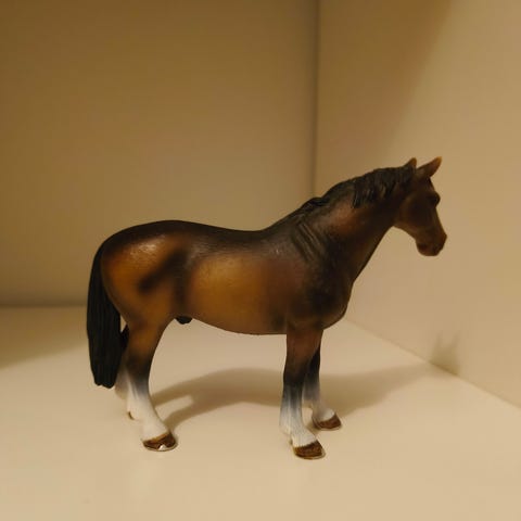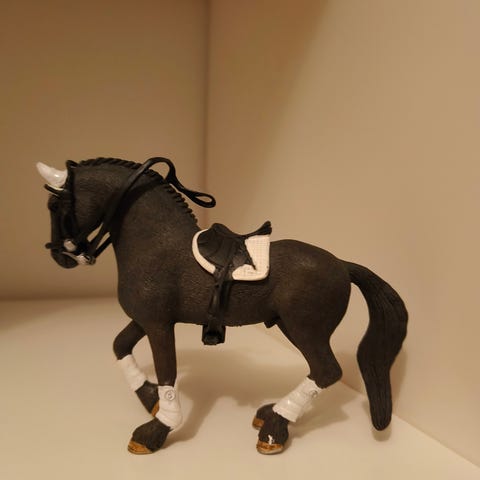 Schleich hevonen 2006. Mukaan tulee satula ja suitset mutta ohjaimet puuttuu.