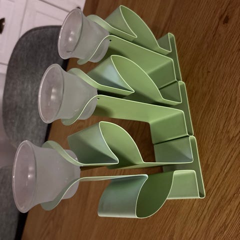 PartyLite kynttilänjalka, jossa on kolme lasista kynttiläkuppia. Kynttilänjalka on valmistettu lasista ja siinä on tyylikäs, kaareva muotoilu.